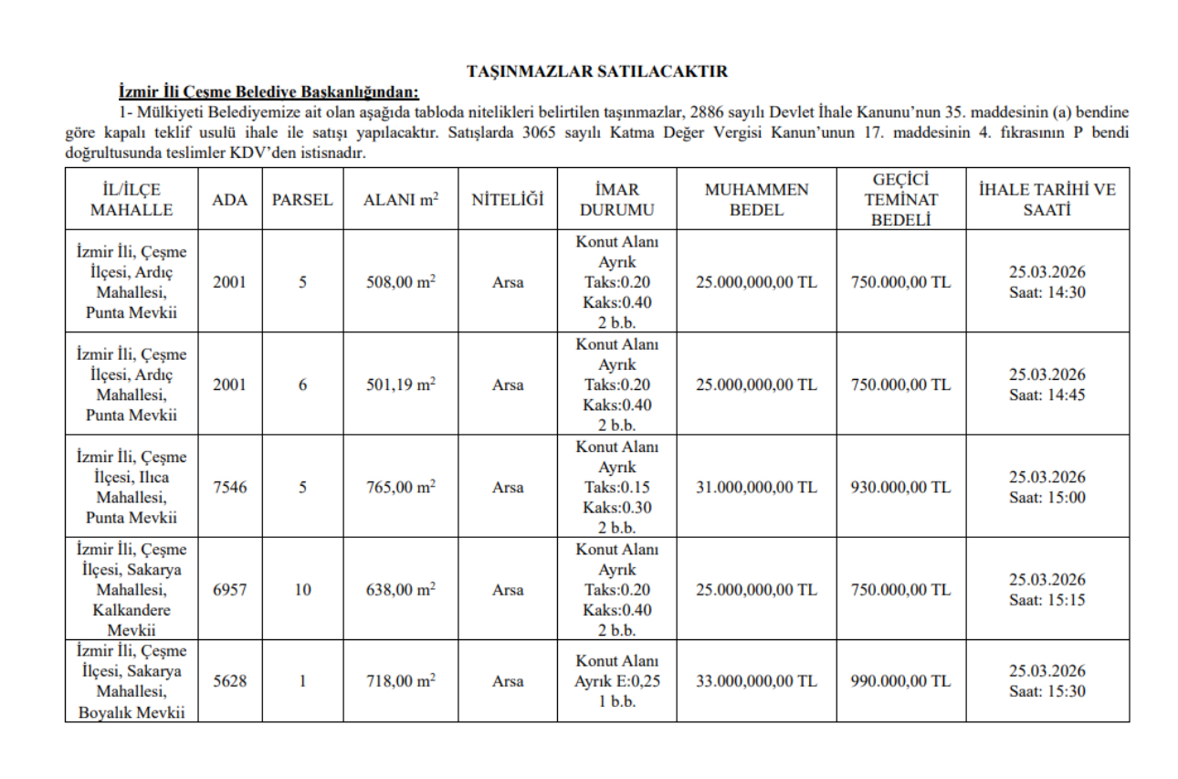 Çeşme Belediyesi tarafından yayımlanan ilana göre, mülkiyeti belediyeye ait Ardıç, Ilıca ve Sakarya mahallelerinde bulunan arsalar, 2886 sayılı Devlet İhale Kanunu’nun 35’inci maddesi kapsamında kapalı teklif usulüyle satışa sunulacak. Satış işlemlerinin Katma Değer Vergisi’nden muaf olduğu belirtildi.