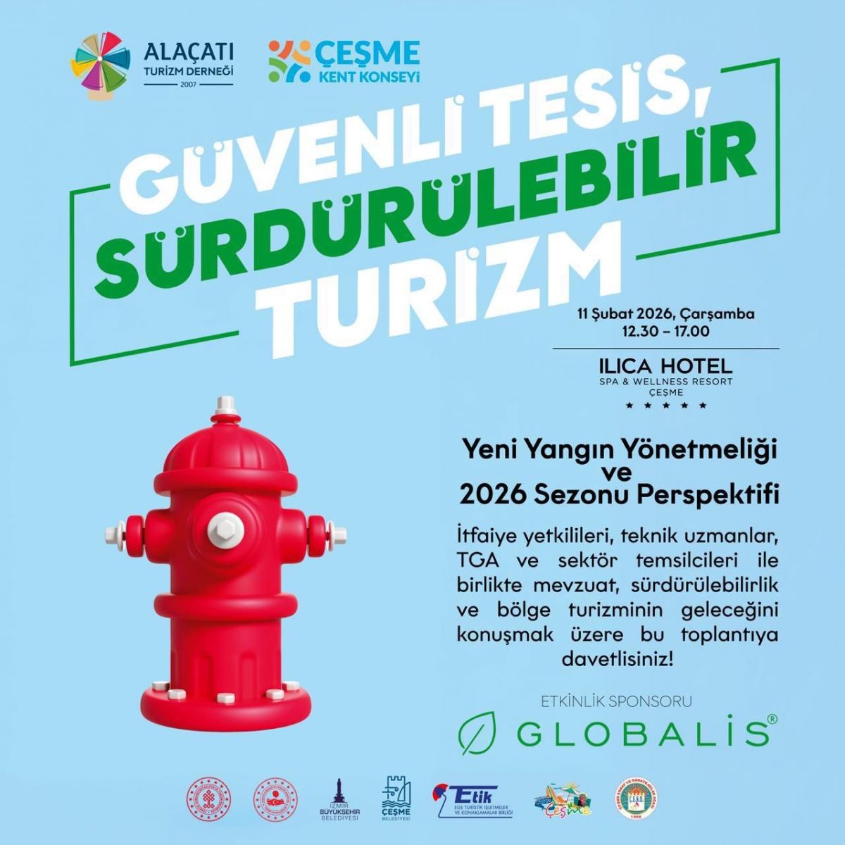 Alaçatı Turizm Derneği öncülüğünde gerçekleştirilecek “Güvenli Tesis, Sürdürülebilir Turizm – Yeni Yangın Yönetmeliği ve 2026 Sezonu Perspektifi” başlıklı toplantı, 11 Şubat 2026 Çarşamba günü 12.30–17.00 saatleri arasında Ilıca Hotel’de yapılacak.
