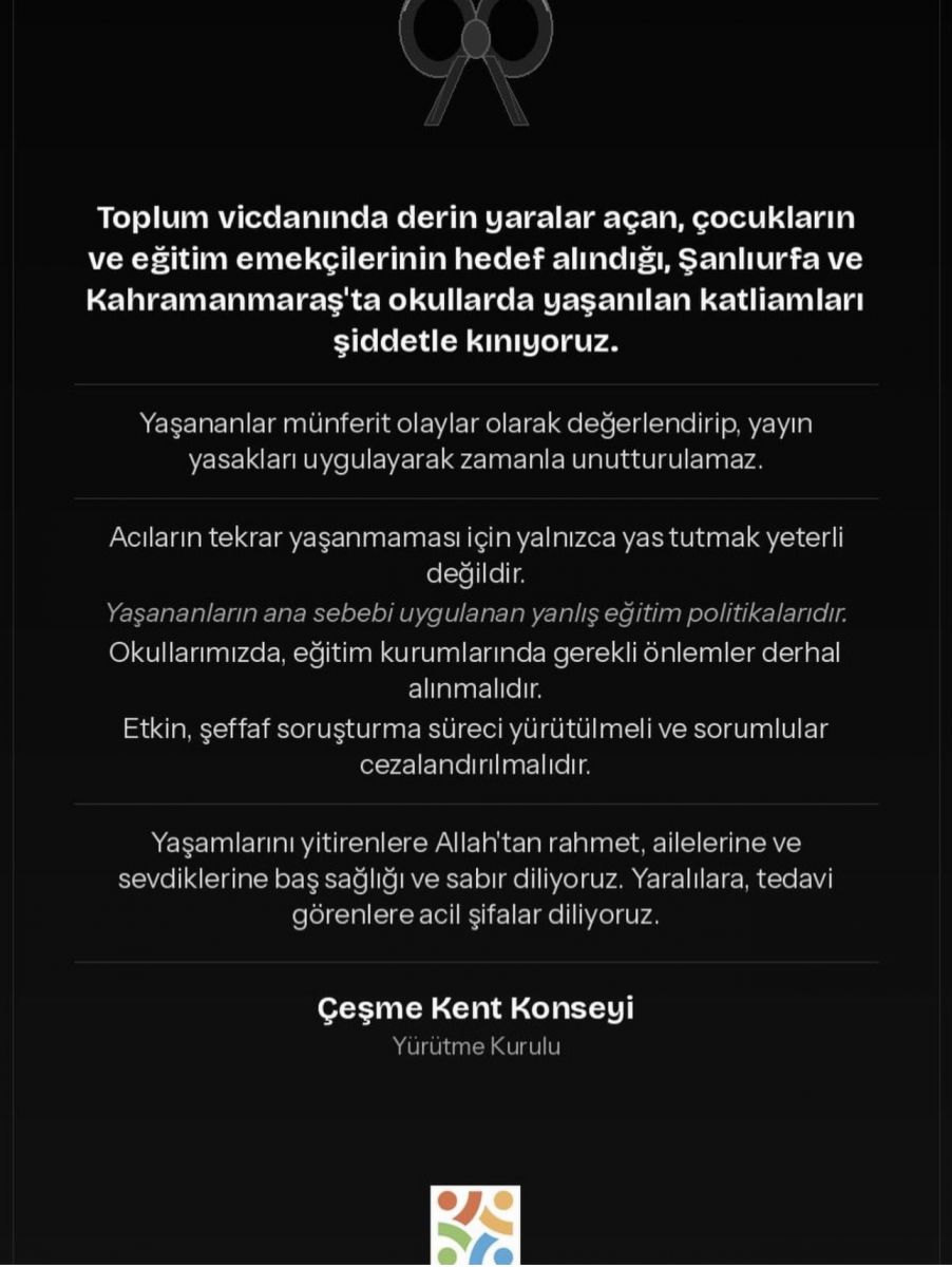 Çeşme Kent Konseyi Yürütme Kurulu, Şanlıurfa ve Kahramanmaraş’ta okullarda yaşanan ve toplum vicdanında derin yaralar açan saldırılara ilişkin yazılı bir açıklama yaptı.